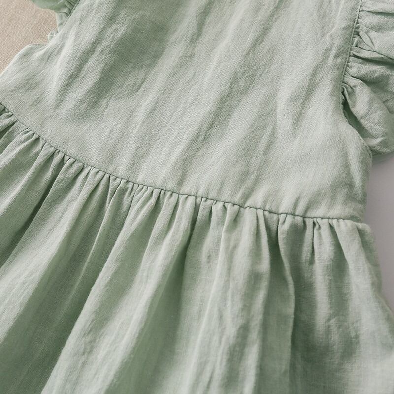 ★送料無料★ 3カラー グリーン系 緑 女の子 リネン コットン 麻 ノースリーブ フリル袖 ナチュラル ワンピース 子供 キッズ 赤ちゃん ベビー 春 夏 韓国 プチプラ キャミワンピ キャミソール