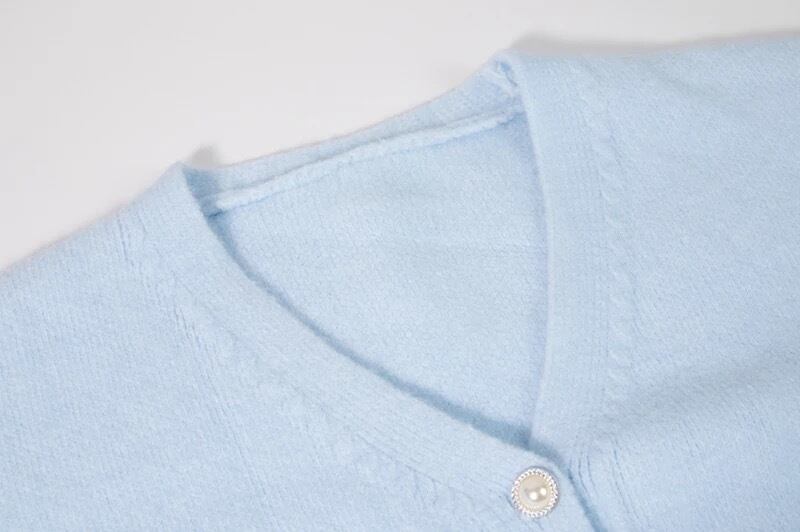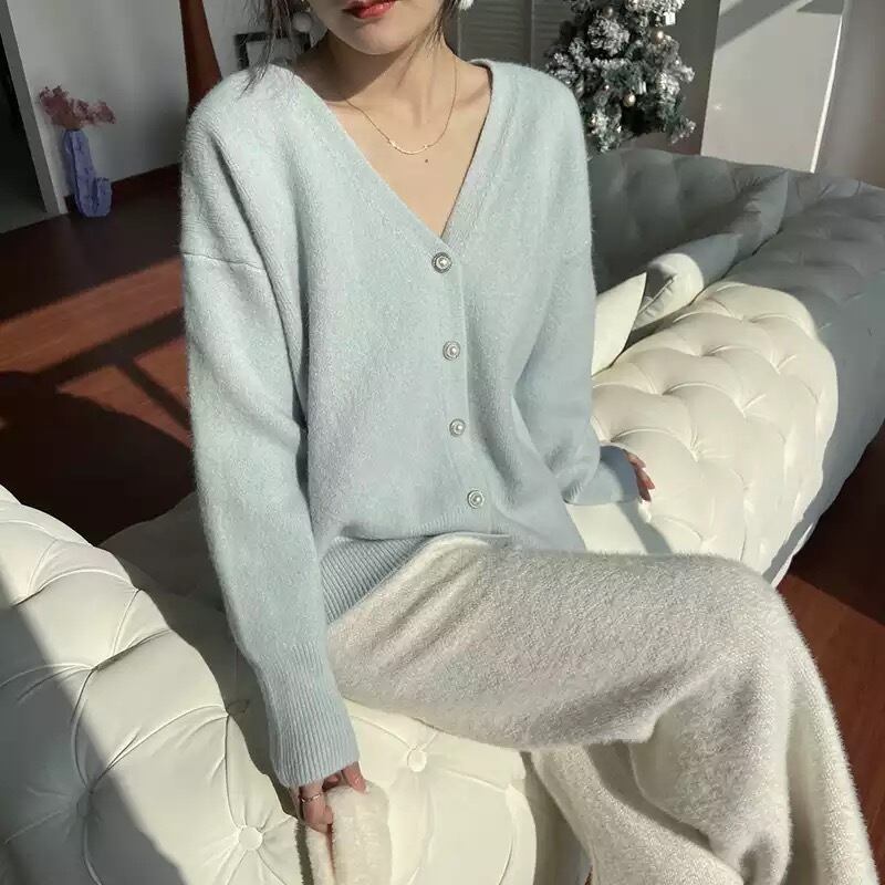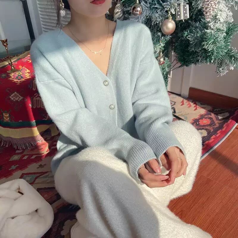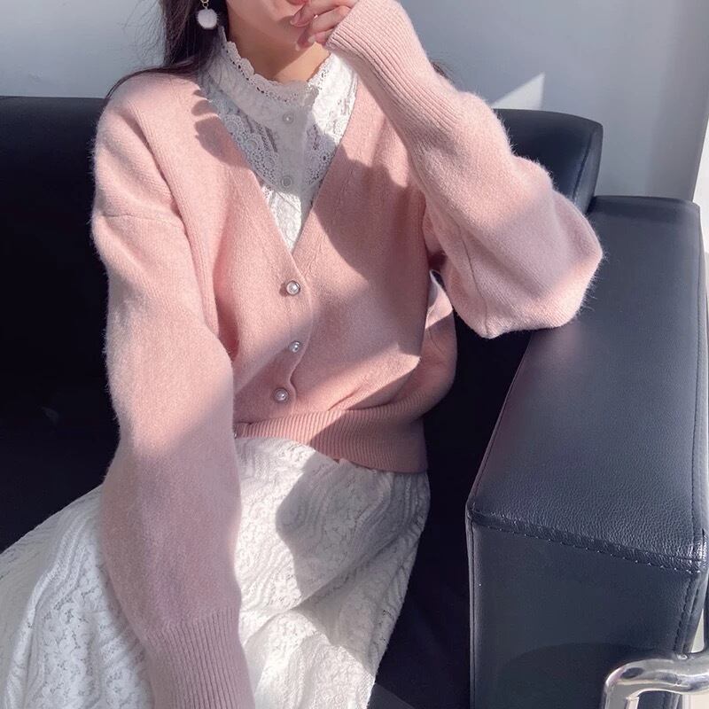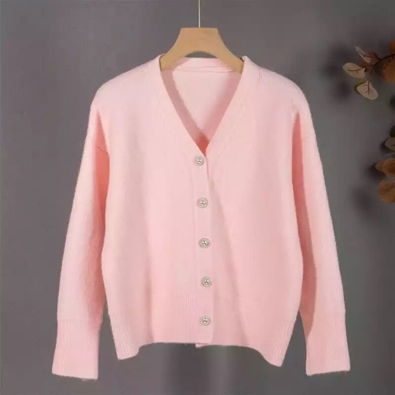 ★送料無料★ 2色 レディース カーディガン Vネック ニット セーター パステル ふわふわ もこもこ パール風ボタン パールボタン シンプル 韓国 おしゃれ 秋 冬 フワフワ モコモコ
