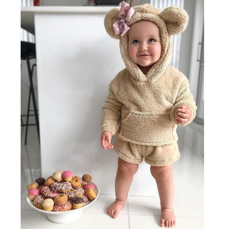 ★送料無料★ 3カラー ホワイト 白 キッズ 耳付き もこもこ ふわふわ セットアップ パーカー パンツ ズボン 韓国 子供 キッズ ベビー 男の子 女の子 フード フワフワ モコモコ ポケット 短パン ハーフパンツ 秋 冬