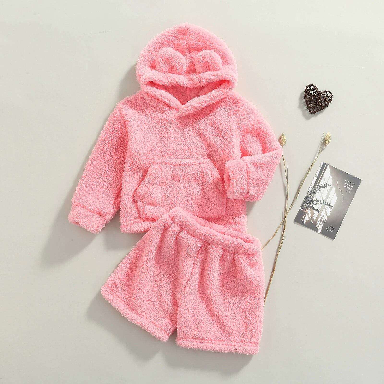 ★送料無料★ 3カラー ピンク キッズ もこもこ ふわふわ セットアップ パーカー パンツ ズボン 韓国 子供 キッズ ベビー 男の子 女の子 フード フワフワ モコモコ ポケット 短パン ハーフパンツ 秋 冬