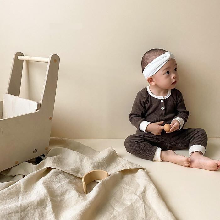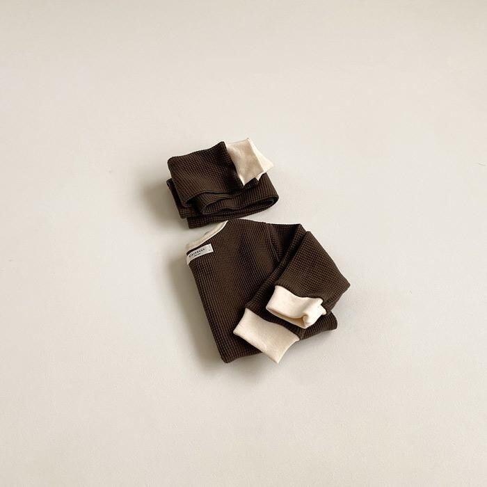 ★送料無料★ 2カラー 女の子 男の子 ワッフル セットアップ 長袖 カットソー パンツ セット 長ズボン ズボン ボタン バイカラー ヘンリーネック 部屋着 ルームウェア パジャマ 秋 冬 韓国 ベビー 赤ちゃん