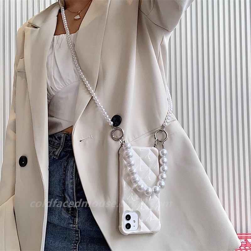 iPhone ケース スマホ アイフォン プチプラ 韓国 中国 海外 おしゃれ かわいい かっこいい 最新 売れてる パール 風 調 真珠 ストラップ 首掛け ネック ショルダー キルティング ホワイト 白