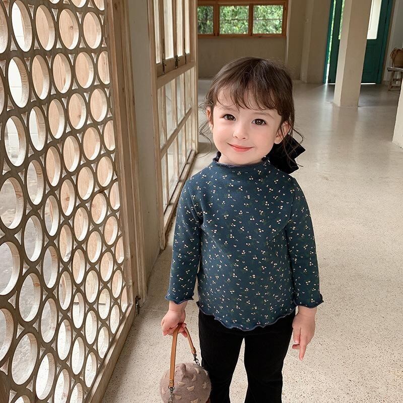 ★送料無料★ 3カラー コーヒーブラウン 女の子 花柄スタンドカラー長袖カットソー 80cm〜130cm 秋 冬 韓国子供服
