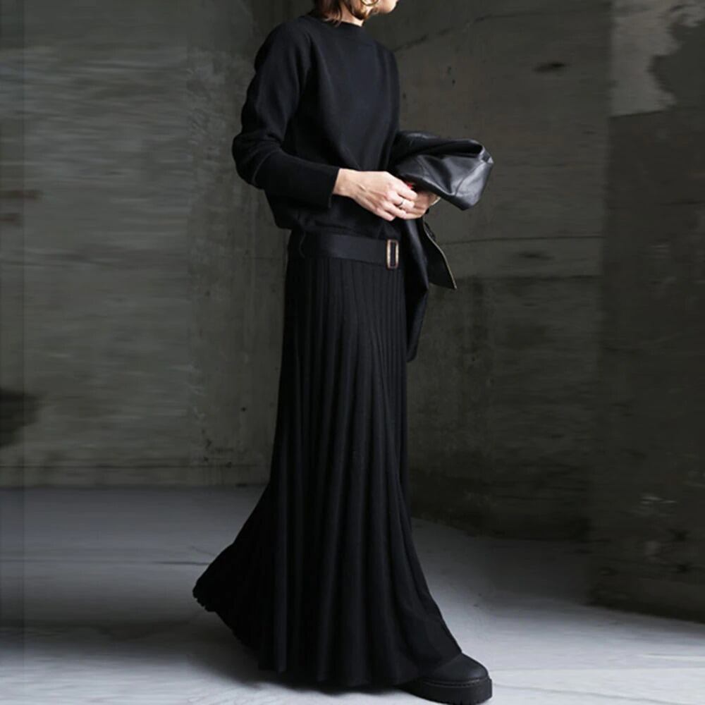 レディース 女性 用 韓国 海外 プチプラ 服 おしゃれ かわいい かっこいい カラー コーデ きれいめ きれい目 上品 ワンピース ワンピ ニット セーター ロング マキシ 丈 ナチュラル ブラック 黒 グレー ダーク 灰色 ウエストマーク ベルト プリーツ 長袖