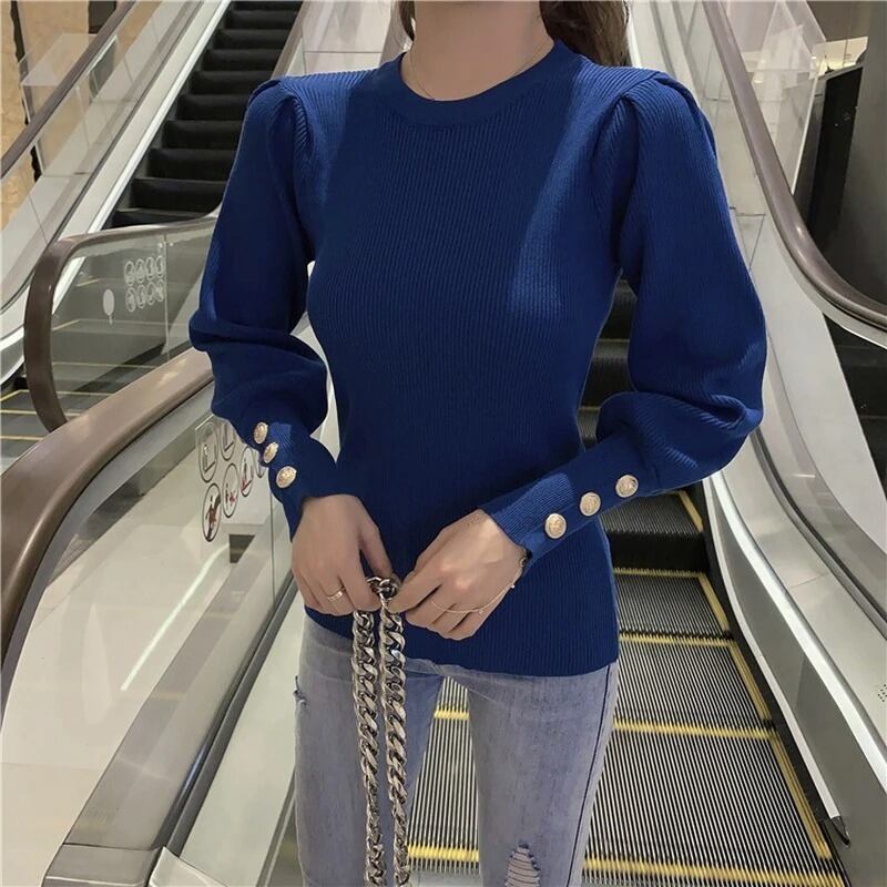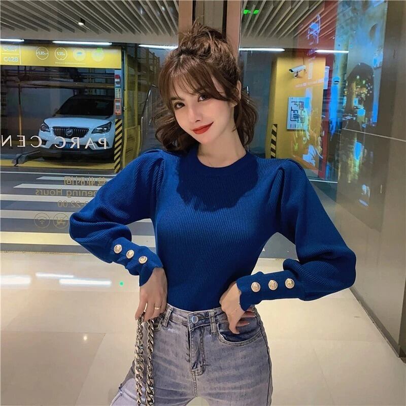 レディース 女性 用 韓国 海外 プチプラ 服 おしゃれ かわいい かっこいい カラー コーデ きれいめ きれい目 上品 ニット セーター ゴールド 金 ボタン Uネック ラウンドネック 長袖 パフ スリーブ