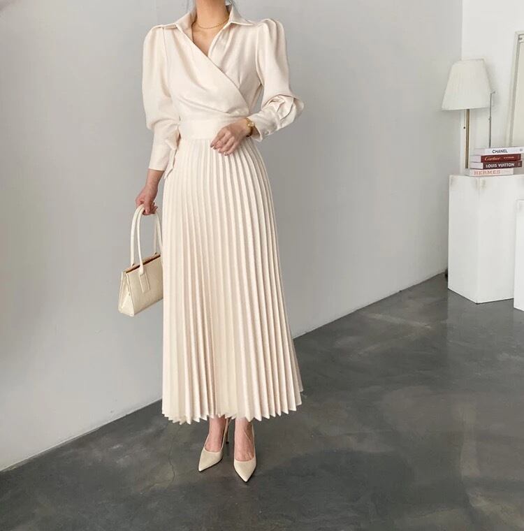 レディース 女性 用 韓国 海外 プチプラ 服 おしゃれ かわいい かっこいい カラー コーデ 綺麗め きれいめ きれい目 大人 かわいい 可愛い 上品 ワンピ ワンピース デザイン ワイド スリーブ プリーツ クロス 長袖 7分 袖 モノトーン ブラック ベージュ アイボリー 象牙 黒