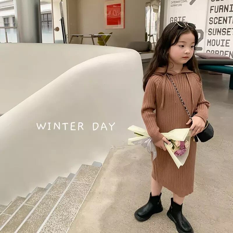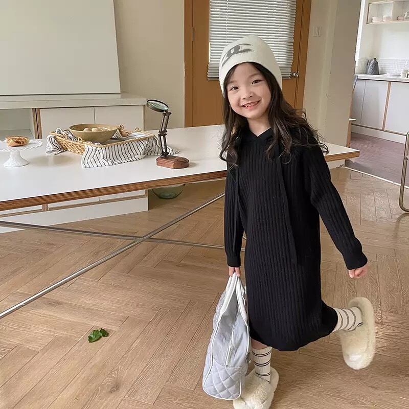 ★送料無料★ 2カラー 女の子 フード付きニットワンピース 90cm~150cm 韓国子供服